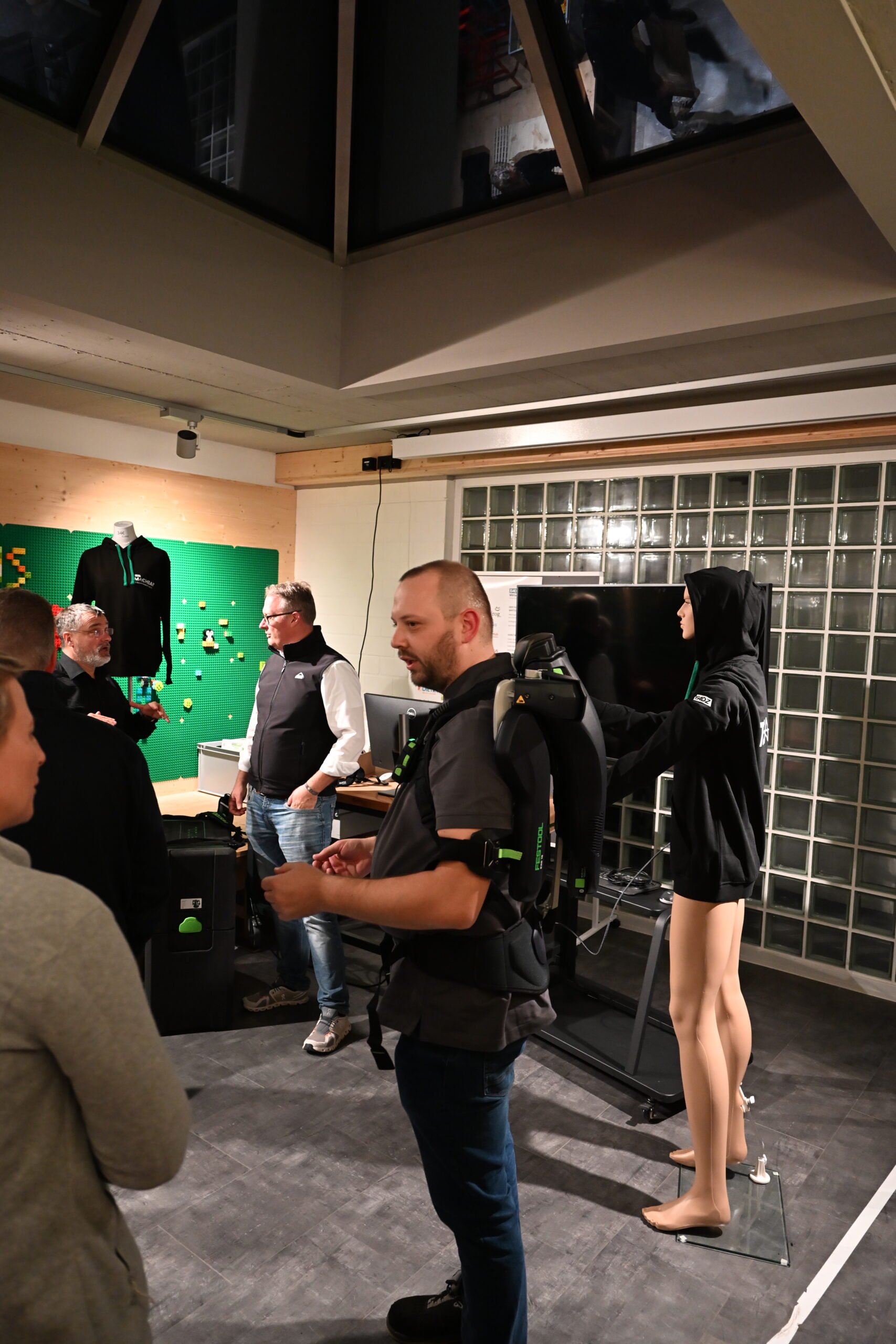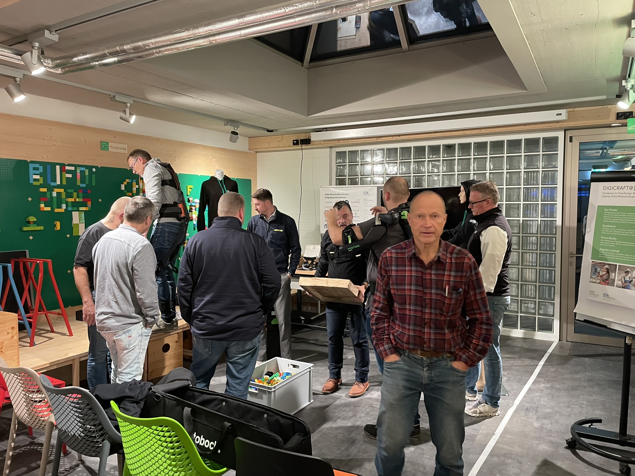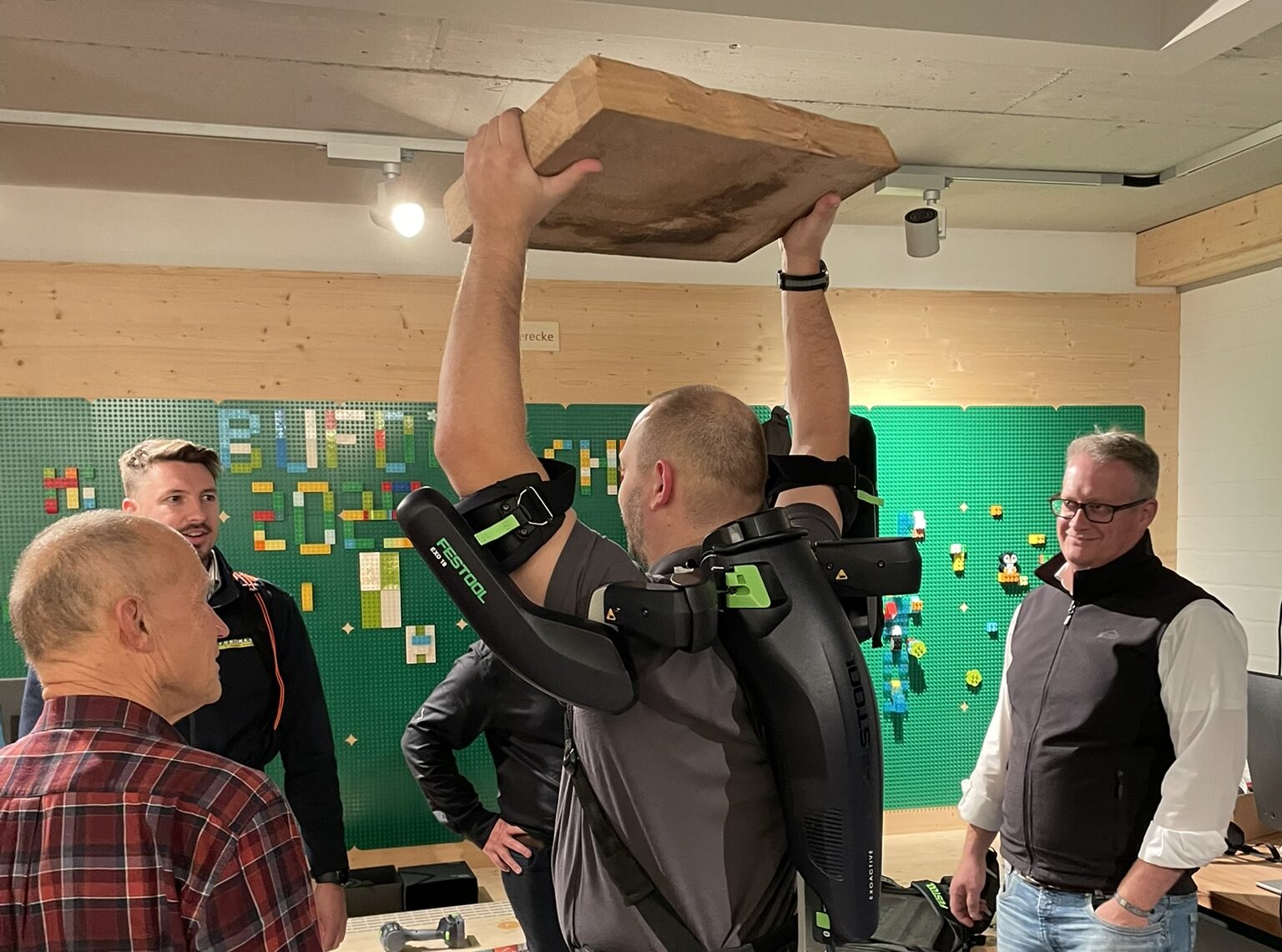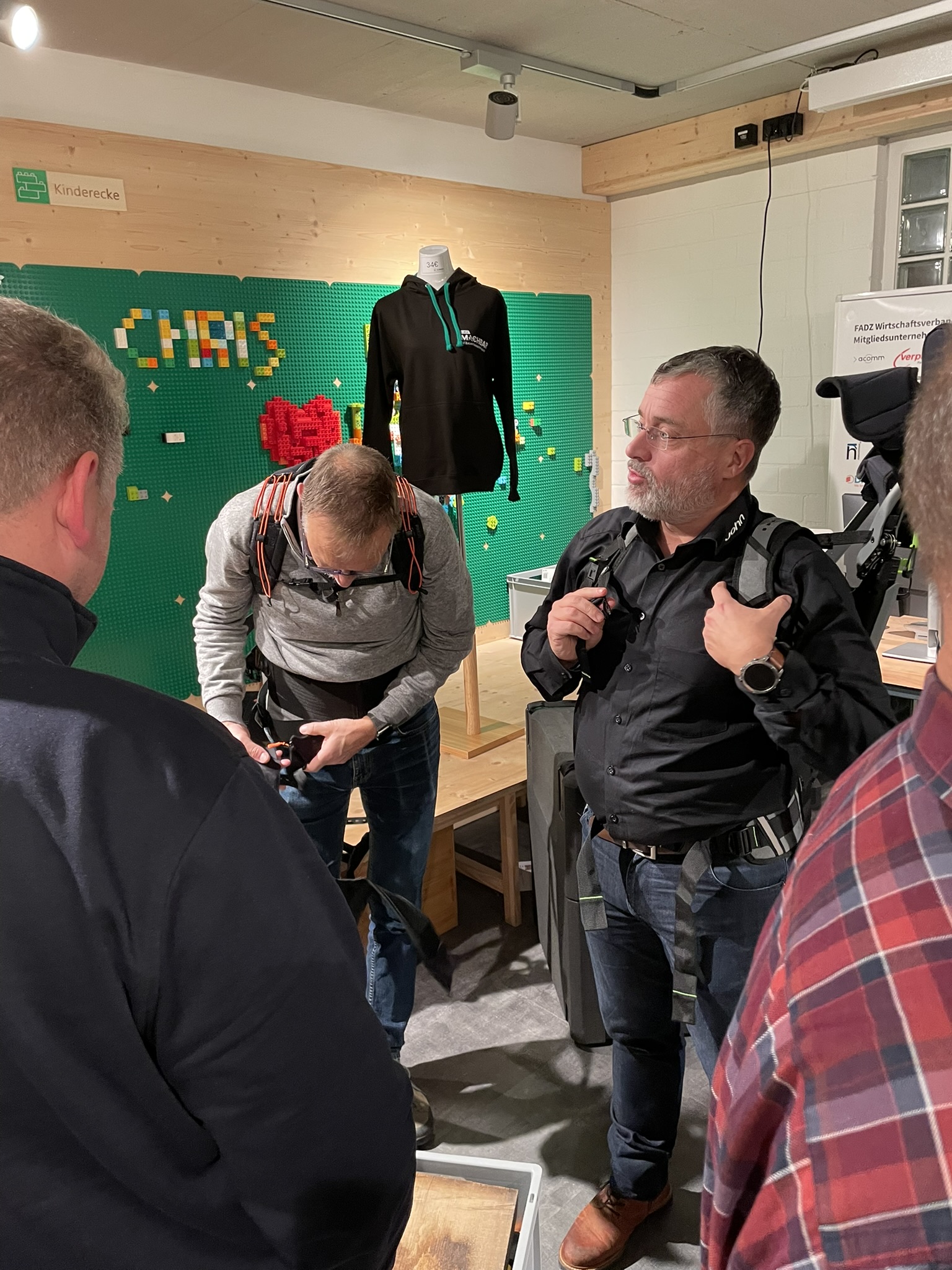 Mehrere Varianten an Exoskeletten standen den Teilnehmenden zur Verfügung, um sie direkt zu testen und deren Nutzen im Arbeitsalltag zu bewerten. Im Rahmend es Projekts haben Unternehmen die Möglichkeit, diese Geräte im FADZ auszuleihen und anschließend in der eigenen betrieblichen Praxis einzusetzen. Vertreterinnen und Vertreter zahlreicher Branchen – vom Schreinerhandwerk über Maler- und Trockenbau bis hin zu Türen- und Torbau sowie Industrieunternehmen – nutzten die Gelegenheit, die Systeme praktisch zu erproben und Anwendungsfelder zu diskutieren.