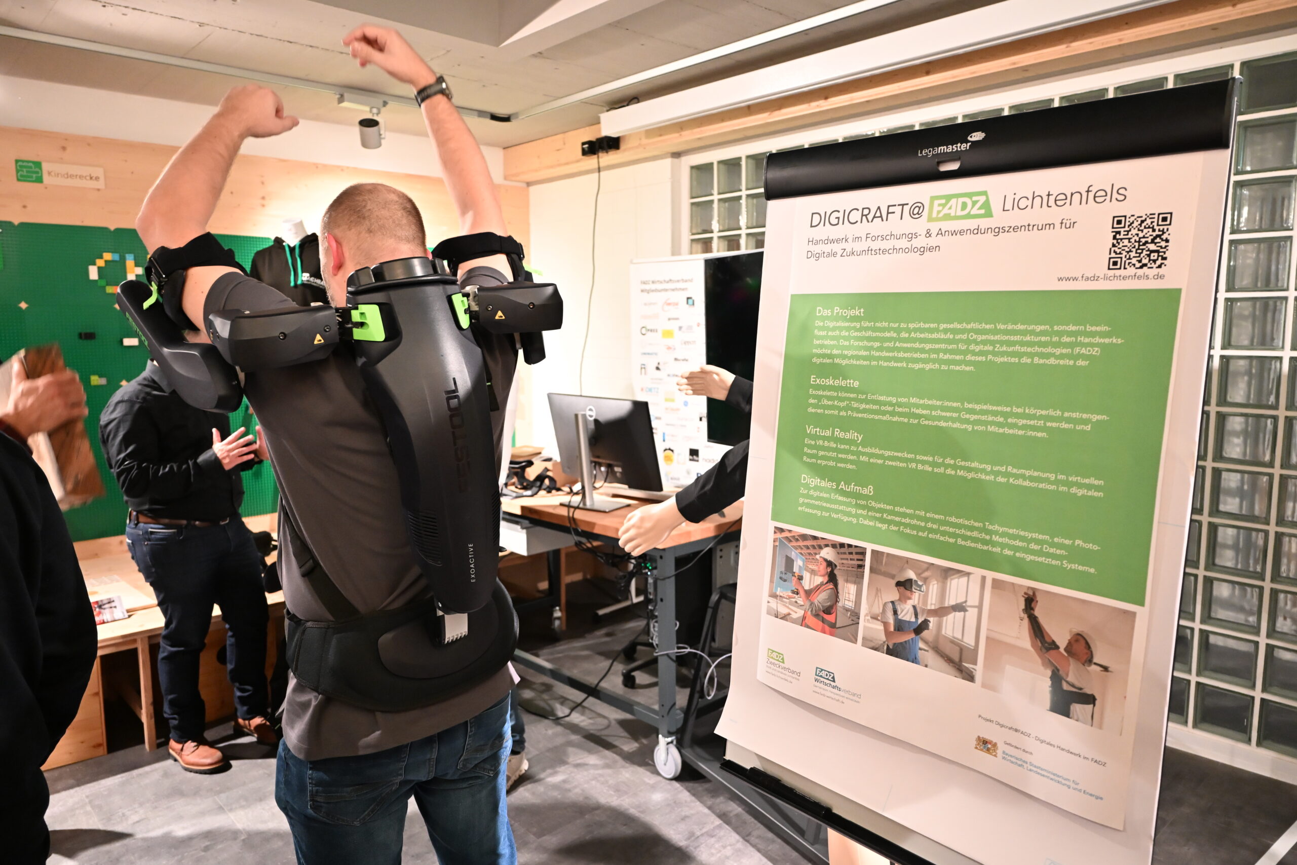 Wie können Exoskelette körperlich anspruchsvolle Tätigkeiten im Handwerk und in der Industrie unterstützen? Dieser Frage widmete sich der gestrige Experten-Talk im FADZ, der in Kooperation mit dem FADZ Wirtschaftsverband stattfand. Im Mittelpunkt stand die praktische Erprobung moderner Exoskelett-Systeme, die im Rahmen des durch das Bayerische Staatsministerium für Wirtschaft, Landesentwicklung und Energie geförderten Projekts „DigiCraft @ FADZ“ angeschafft wurden. Das Projekt „DigiCraft @ FADZ“ entstand im Austausch mit dem Arbeitskreis Digitales Handwerk des FADZ Wirtschaftsverbands.